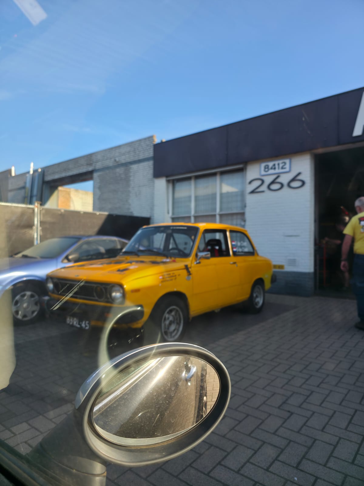 De auto had 25 jaar stilgestaan, was op de trailer naar de APK, qua interieur uit elkaar gehaald, geverfd en met nieuw spul opgebouwd in 6 weken. Dus we mogen vertrekken naar de 1e proef. De auto schakelde absoluut niet dus reed alleen maar maximaal toerental (variomatic). De ventilator koelde niet (genoeg), olie werd er aan alle kanten uitgegooid. Dus voorzichtig de eerste proef, auto hield zich prima, temperatuur van olie/water liep langzaam op maar verder niets aan de hand. KP1 werden de remmen erg heet dus deden niet zoveel meer. Op naar KP2!
